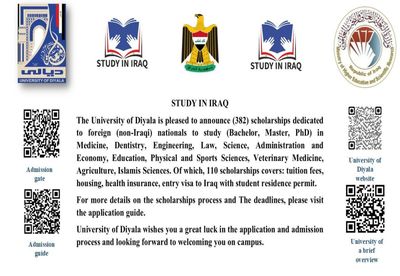 The University of Diyala is pleased to announce (382) scholarships dedicated to foreign (non-Iraqi) nationals to study (Bachelor, Master, PhD) in Medicine, Dentistry, Engineering, Law, Science, Administration and Economy, Education, Physical and Sports Sciences, Veterinary Medicine, Agriculture, Islamic Sciences. Of which, 110 scholarships cover: tuition fees, housing, health insurance, entry visa to Iraq with a student residence permit.